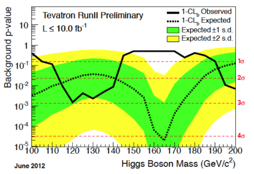 去年 9 月 30 日下午 3 点,在运行了四分之一个世纪后,费米实验室的 Tevatron 对撞机完成了最后一次质子和反质子的对撞。自那时以来,Tevatron 的两个大型实验 CDF 和 D0 的物理学家一直在分析总计 10 费米倒数(inverse femtobarns)的完整数据集,从中榨取所有统计学上的显著性,以搜寻希格斯玻色子。十四年前,我曾协助领导费米实验室一项关于我们需要在“Run 2”(当时计划于 2000 年开始)收集多少数据才能观测到希格斯玻色子的 研究。我们需要多少数据取决于希格斯玻色子的质量,因为质量越大,产生的希格斯玻色子数量越少,希格斯玻色子衰变的方式也会发生变化。我们还假设会升级探测器,但这一假设后来未能实现;2003 年,美国能源部取消了对内部硅跟踪探测器的 5000 万美元升级计划。无论如何,我们的预测是,要获得标准的 5 西格玛(standard-deviation)发现,平均需要大约 20 费米倒数(inverse femtobarns)的对撞数据。如果希格斯玻色子更轻,则需要的数据更少。但 Tevatron 能做到吗?Run 2 的早期阶段,Tevatron 的亮度提升进展缓慢。机器本身出现了很多技术问题,但一个接一个地被克服了,大量的数据样本开始累积。CERN 的 LHC 最初计划于 2005 年底开始对撞,但由于自身挑战也被推迟了,这给了 Tevatron 实验一瞥希格斯玻色子的机会。在十年的后期,情况开始变得像一场赛马,2008 年 LHC 在运行一周后遭受了 灾难性的故障。数据正在从 Tevatron 涌入,到 2009 年年中,约有 5 费米倒数(inverse femtobarns)的数据正在被分析,很难预测会发生什么。然而,在 2009 年底,LHC 在低能量下开启,到 2010 年初,该机器开始以比 Tevatron 高三倍半的能量进行对撞,Tevatron 的能量略低于 2 TeV(万亿电子伏特)。这个优势至关重要:更高的能量意味着在给定质量下会产生更多的希格斯玻色子,因为我们实际上是对质子内的组成部分进行对撞。但即便如此,到 2010 年底,LHC 积累的数据也只有 0.035 费米倒数(inverse fembobarns),远不足以观测到希格斯玻色子,而 Tevatron 预计到 2011 年夏末将达到 10 费米倒数(inverse femtobarns)。然后 LHC 加大了力度,在 2011 年开始认真对撞,仍然以 7 TeV 的能量,到去年夏天,LHC 实验已经拥有了一整费米倒数(inverse femtobarn)的数据进行分析,并且很明显,如果 LHC 保持这样的运行状态,到年底它积累的数据样本将至少和 Tevatron 实验一样灵敏,甚至更灵敏。确实,在年底出现了关于 125 GeV 希格斯玻色子信号的迹象,LHC 的 CMS 和 ATLAS 实验分析了近五费米倒数(inverse femtobarns)的数据。在 2012 年冬季会议上,CMS 和 ATLAS 实验将希格斯玻色子可能存在的质量窗口大幅缩小,范围在 115-130 GeV 之间。由于两台机器可用的搜寻通道的特殊性,这个质量范围的低端对 Tevatron 有利,因为它对希格斯玻色子衰变成底夸克对更敏感,而高端对 LHC 有利,因为它对更罕见的衰变成一对光子或 Z 玻色子更敏感,这两种衰变都会产生非常尖锐的质量峰。如果 125 GeV 的野兽迹象被证实是真的,那么 LHC 将赢得这场竞赛。正如我开头所说,Tevatron 的目标很明确:提取尽可能多的统计学显著性。分析师们做得非常出色,今天公布了最终答案:数据中出现了广泛的过量信号,与 125 GeV 希格斯玻色子衰变成 b 夸克对一致。结合两个实验的数据,该质量下的统计学显著性相当于约 2.5 西格玛。图表中显示,黑线(表示仅背景看起来与观测结果相似的概率)下降到接近三西格玛的水平。周三,在 CERN,LHC 实验将公布将 2011 年的大量数据样本与 2012 年更高能量(8 TeV)的更大样本结合后的结果。这显然是一个激动人心的时刻——敬请关注!