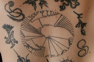 卡尔:生命之树的形状多年来发生了变化。在 另一个纹身上,你可以看到十九世纪的版本,它的树枝穿越时间向上延伸。今天,科学家们使用 DNA 来绘制数千个物种的树枝。为了容纳它们,科学家们必须将树伸展成一个轮子。克莱尔根据德克萨斯大学的戴维·希利斯 (David Hillis) 创建的一个拥有 3000 个物种的树 创建的树 来设计她的树。显然,她并没有将所有 3000 个物种纹在身上,但这个简化的版本捕捉了树的整体形状。树周围的图片代表了五大王国——单细胞生物 (细菌)、原生生物 (阿米巴和其他单细胞生物)、植物界 (植物)、真菌界 (此处以酵母和青霉菌霉菌为例) 和动物界 (栉水母、软体动物、海星和海龙鱼)。当然,即使是 3000 个物种也只是生命多样性的微小一部分——已知的 180 万个物种,可能还有 1000 万到 2000 万个物种尚未被发现。如果目前的发现趋势保持下去,这些多样性中的大部分将由细菌构成。因此,未来的纹身需要更多的微生物,更少的海龙鱼。点击此处前往完整的科学纹身商铺。