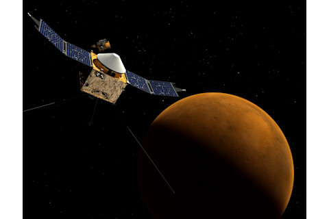 MAVEN 航天器在火星轨道上运行的艺术家概念图。(图片来源:NASA/ Goddard Space Flight Center)