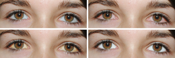 图 1:一位年轻成年女性的代表性刺激图像。巩膜未被修改(左上角)、发红(右上角)、发黄(左下角)或美白(右下角)。数字着色图像(红色、黄色或白色)与未修改的对照图像进行对比*(*现在是“Seriously, Science?”的“红火科学周”。本周我们将重点介绍以红色为主题的科学内容。)*