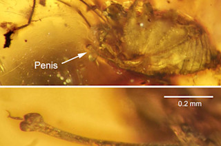 或者,研究人员推测,这只收获螨可能是在与粘稠的树脂搏斗时发生了勃起,导致其血淋巴(血液)压力升高,从而使其生殖器硬化。
