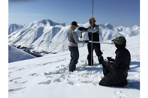 社区积雪观测站团队于 2022 年 4 月在 Turnagain Pass 测量积雪含水量(SWE)。(来源:Gabe Wolken)
