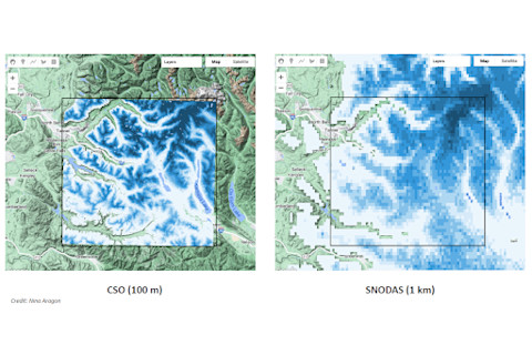 右侧是使用典型的积雪数据同化系统(SNODAS)数据的积雪模型。左侧是使用公民科学家收集的 CSO 数据的同一区域的模型。这带来了巨大的差异!(来源:Nina Aragon)