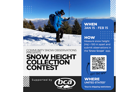 让我们以强劲的开局开始新的一年,找出我们的山区积雪堆积情况!本次比赛的规则很简单:我们将从在 1 月 15 日至 2 月 15 日期间提交积雪高度测量次数最多的人中选出前 5 名获胜者。积雪高度测量值之间的距离需要至少为 100 米,并且在未受干扰的积雪中进行。观测必须通过 Snow Scope 应用程序提交才能获得资格。奖品由 Backcountry Access 捐赠,包括:一套 BCA 无线电、一把 BCA 雪崩铲、一把 BCA 雪锯、一套 BCA 雪地研究套装以及 CSO 精品。奖品仅寄往美国地址。