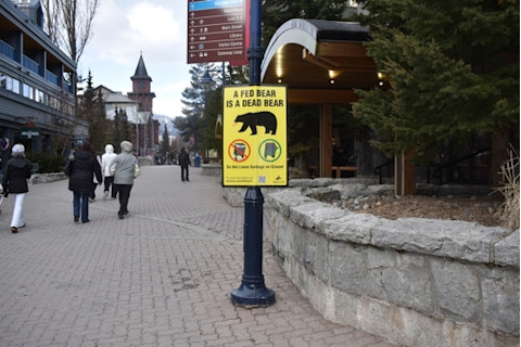 (图片来源:Jennifer Jessica Peck/Shutterstock) 加拿大不列颠哥伦比亚省惠斯勒 - 2023 年 3 月 27 日:惠斯勒村的“喂饱的熊就是死的熊”的标语。