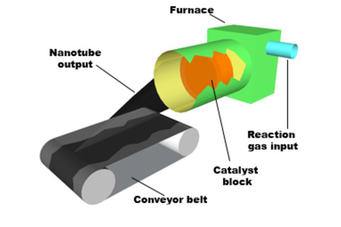 Nanocomp Technologies制造工艺的核心是一个长圆柱形炉。含有碳基原料(原料)的反应气体被送入炉子的一端。气体沿炉子扫过,直到遇到一个涂有催化剂的加热的多孔块。当它穿过多孔时,气体被迫与催化剂接触,碳纳米管开始形成。多孔块和炉子开放端之间的温度梯度支持管的生长,吸收反应气体的材料。最终,纳米管离开圆柱形炉,看起来像一团蓬松的、黑色的管状棉花糖。旋转的锚或传送带捕获纳米管,将它们变成纱线和片材。