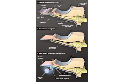 (图片来源:Science Translational Medicine)生物物理学方法 其他基因疗法递送系统在很大程度上依赖于物理学,同时也依赖于化学。一种称为基因枪(gene gun)的设备将包裹着所需 DNA 的微小金或钨球射入细胞。一旦进入细胞,遗传物质就会与球体分离。电穿孔(electroporation)是一种利用电在细胞膜上打出临时孔洞,以帮助裸 DNA 进入细胞的物理基因疗法技术。研究人员还在研究超声波、流体动力学和磁力递送方法。DNA 带有电磁荷——由于称为磷酸基团的化学实体,它带负电荷。这使得 DNA 分子可以在电磁场中被定向,从而为将遗传组件和电子组件融合提供了可能性。这是《黑色孤儿》中形似蛆虫的植入物所依据的生物物理学现实,但它也是一种正在现实世界中出现的基因疗法植入物。你可能认识使用过或自己拥有过人工耳蜗(cochlear implant),你知道它们可以将空气中的声波转化为神经信号。但研究人员已经在豚鼠身上证明,人工耳蜗也可以用于DNA 的电注入,将 DNA 分子注入从耳蜗(内耳的听觉部分)向大脑传递冲动的神经元。这些神经元构成了前庭蜗神经的蜗神经分支,但它们的退化会导致神经性耳聋。用产生神经营养因子(neurotrophins)的基因治疗这些细胞可以再生神经,因此下一步是为人类开发类似的人工耳蜗。虽然尚未在人类身上开始测试此类植入物,但可能在几年内发生,当然,这会比你看到《黑色孤儿》式的植入物从脸颊向体内发送遗传物质要早。