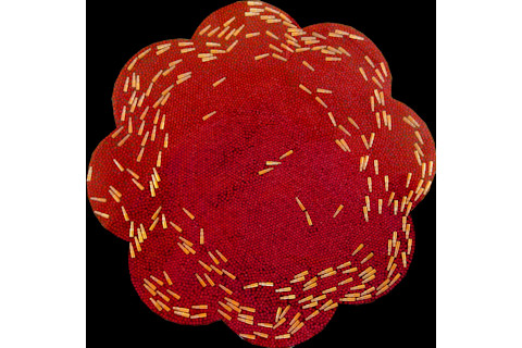 一层毫米级的、锥形的黄铜棒在振动表面上自发地排列,周围分布着铝珠。板子的花朵形状有助于维持棒的流动,揭示了其背后的物理原理。(图片来源:Ajay Sood/印度科学研究所)