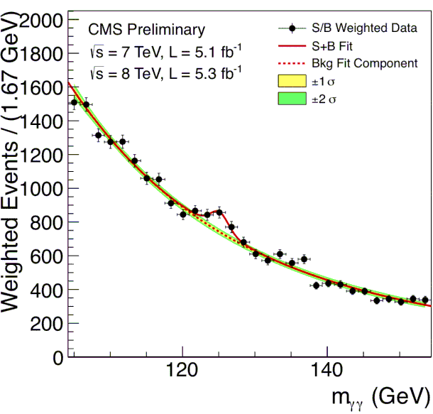 这张图展示了LHC 探测器之一看到的发现。稍安勿躁,我来解释一下!好了,简单版来了。希格斯粒子极其重要,因为粒子物理学的标准模型——关于所有粒子如何行为的基本理论——预测它的存在,并且它是(间接)赋予许多其他粒子质量的原因。换句话说,电子、质子和中子之所以有质量,就是因为这个希格斯“大家伙”。去年,《卫报》刊登了一篇很好的文章来解释这一点。在 Discover Magazine 2007 年的Cosmic Variance 博客上,有更具技术性的讨论。 Sean Carroll 一直在实时直播这次宣布,也有很多好信息。这种粒子很难探测,因为它不长寿。一旦形成,它就会以极快的速度衰变成能量和其他粒子(想象成弹片)。制造它们的唯一方法就是以极高的能量将其他粒子碰撞在一起,并观察产生的碰撞。如果希格斯粒子存在,那么它就会衰变并释放出特征性的能量。问题是,很多东西都会释放出那么多的能量,所以你必须在所有这些噪声之上看到希格斯信号。因此,你必须一遍又一遍地、无数次地碰撞粒子,才能从希格斯衰变中积累起微弱的信号。你做得越多,信号就越大,你就能越有信心认为检测是真实的。 去年 12 月,当 LHC 的初步结果公布时,我详细描述了这一切。我强烈建议你先阅读那篇文章!现在回来了吗?很好。所以去年,在约 125 GeV 的能量下出现了一个信号过载——这是物理学家使用的能量单位,也表明了衰变粒子的质量。因为能量和质量在某种程度上是可以互换的,检测粒子衰变时释放出的能量就可以知道它的质量。一个质子的质量大约是 1 GeV,所以这个发现的过载大约是它的 125 倍。去年的结果虽然诱人,但信号的强度只带来了约 90% 的置信度,表明它是真实的。很好,但不足以宣布发现。今天,这一切都改变了。LHC 上的两个不同探测器都独立地在 125 到 126 GeV 之间发现了强烈的信号,置信度约为 5 西格玛——