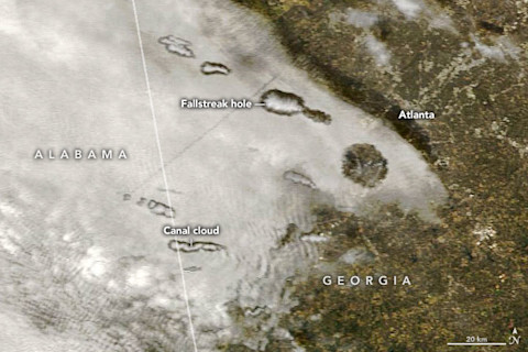 上面这张假彩色图像是由美国宇航局的Terra卫星拍摄的,显示了今年1月下旬在佐治亚州上空形成的雨滴空洞。还可以看到它们更长、更细的近亲,被称为“条状云”,它们是由相同的物理机制形成的。