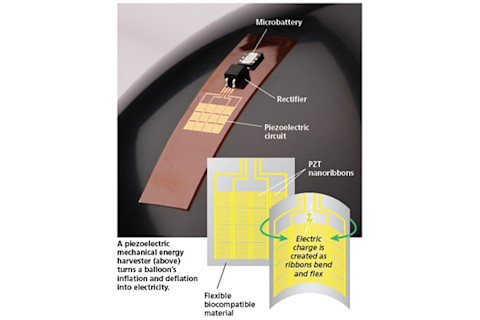 Dagdeviren 的能量收集器建立在一个柔性基础上。其成功的秘诀在于 PZT,即锆钛酸铅,它具有压电性。这意味着它在弯曲和放松时会产生微小的电荷。例如,将该设备附着在肺部,随着人吸气和呼气,设备会改变形状——产生稳定的电流。