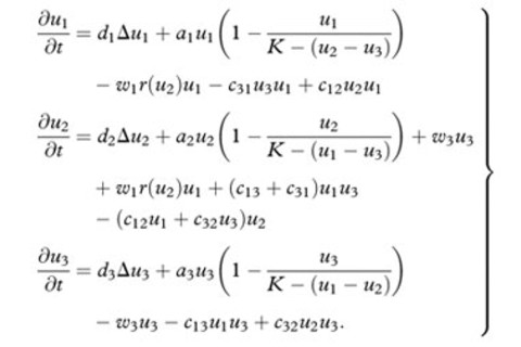 坎德勒的模型:这些偏微分方程分别对应一群使用者:英语使用者、盖尔语使用者和双语使用者。变量代表社会情境的各个方面;例如,c12 和 c32 表示双语使用者成为单语使用者的可能性。| 坎德勒等人