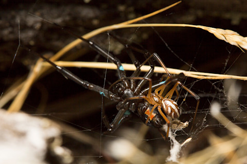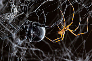 一只雄性黑寡妇蜘蛛会使用触肢(奇怪的精子传递器官)与雌性交配。它通过雌性释放的信息素找到她的网。(图片来源:Sean McCann)