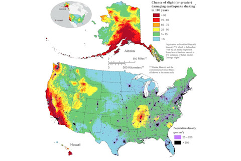 美国地质调查局地图显示了美国地震造成破坏性震动的可能性。来源:美国地质调查局。