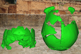 妖精头骨!开玩笑的。为这两块部分人类颅骨重建选择的鲜绿色确实让它们在背景中脱颖而出,背景是它们在中国发现地的照片。图片来源:吴秀杰。大约10万年前是一个对我们物种至关重要的时期——但化石记录中对此却鲜有体现。两块来自中国中部的人类部分头骨正在帮助填补一些谜团,但它们兼具古老和现代智人特征以及一些尼安德特人特征,也引发了新的问题。从生物学上讲,我们现代智人是真正的新来者。古人类学家通常将我们物种的出现日期定在20万年前以内,在非洲。那时,我们属的其他许多成员已经探索了欧亚大陆的大部分地区,从欧洲大部分地区的尼安德特人及其祖先到格鲁吉亚共和国德马尼西的神秘古人类,从印度尼西亚以前被称为爪哇人(现称特里尼尔2号)的古人类到北京郊外的北京猿人。更别提丹尼索瓦人了,他们可能在那段时间里已经在西伯利亚四处奔跑。现代智人从非洲迁徙的确切时间一直是古人类学家之间争论的焦点,提出的日期越来越早。一些研究人员认为现代人类是区域性出现的,不仅在非洲,而且在欧亚大陆的两个或更多地点。现在,研究人员描述了两块来自中国中部许昌凌井的部分人类头骨化石,它们具有科学家所说的镶嵌特征:有点古老,有点新,有点奇怪,所有这些都是独特的混合。这些被称为许昌1号和2号的部分颅骨至少有10万年的历史,但可能长达12.5万年。充分披露:该地点和这些部分颅骨都不是科学界的新发现。这些颅骨在2007年至2014年间被挖掘出来,该地点还发现了不同时期的其他人骨遗骸,这此前曾在《许昌学院学报》上引发了一些相当激动人心的报道。