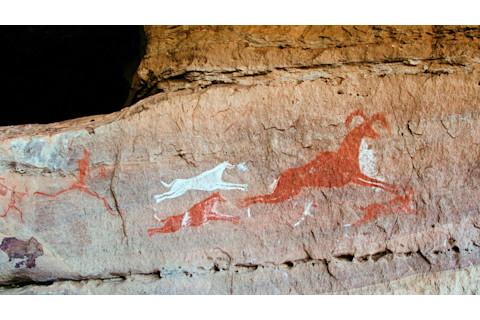 利比亚史前洞穴壁画描绘了一位猎人追逐猎物。Pier Marco Tacca/Getty Images