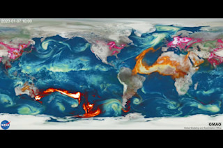 该可视化图由一个依赖于多颗卫星观测的模型生成,显示了气溶胶——微小的液滴和固体颗粒——在大气中的运动。除了烟雾、沙漠尘埃和海浪中的盐分,这些气溶胶还可能来自火山爆发、人类活动造成的空气污染和其他来源。