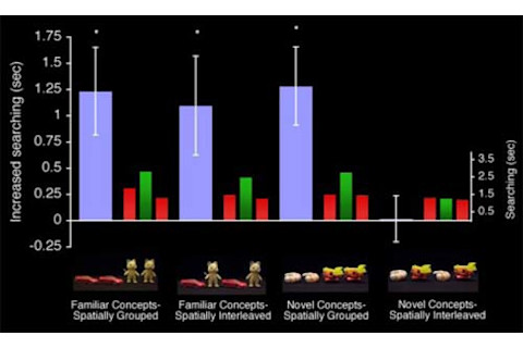 对于熟悉的物体,如猫和汽车,物体的位置并不重要——这对物体可以分开或混合摆放,婴儿仍然记得搜寻所有四个。但对于他们以前从未见过的物品,如坦克和虾,只有当匹配的物体放在一起时,他们才会搜索相应的时间(例如,坦克-坦克-虾-虾,而不是坦克-虾-坦克-虾)。因此,婴儿只能在组块新颖物体时,将它们以一种使它们之间的相似性更清晰的系统方式组合在一起。