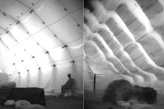 庇护所最初是PVC涂层聚酯布,这种材料强度较低时用于工业防水布和泳池盖。然后将这些布料塑造成空心柱。为了创建庇护所的支架,这些部件使用传统的焊接和射频焊接(使用电磁力而不是外部热量)熔合在一起。