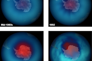 自20世纪80年代以来,南极上空的臭氧层受到的影响尤其严重,因为该地区的严寒温度加速了氯氟烃向氯的转化,这也加速了臭氧的分解。南半球春夏季节的阳光产生了更多的消耗臭氧的气体,导致多达65%的臭氧层被大量破坏。