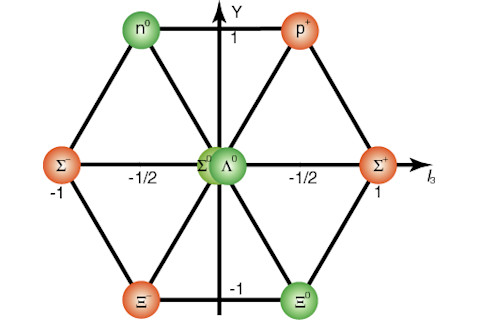 一张图说明了盖尔曼的“八重径”对称性(这早于他发现 Omega-minus 粒子及其导致的新对称性)。*** 图片由 CERN 提供