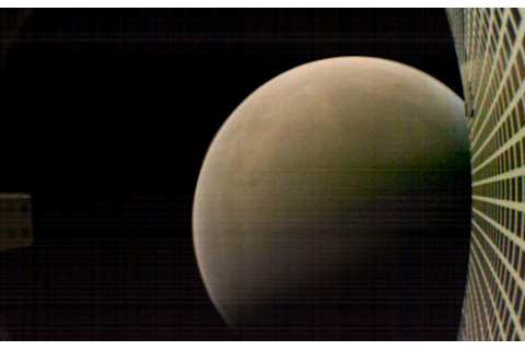 MarCO-B(瓦力)在近距离接触火星后拍摄了这张令人振奋的火星照片,当时它距离火星7600公里。右侧的网格是探测器的通信天线。(来源:NASA/JPL-Caltech)