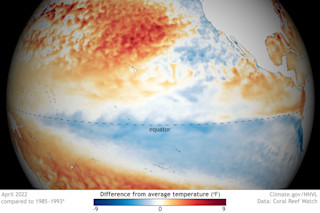 这张动画展示了2020年1月至2022年5月热带太平洋海表温度的月度演变。动画开始时呈现中性状态。2020年8月,指示比平均温度低的蓝色开始沿着赤道扩散,达到了拉尼娜的阈值。拉尼娜在2021年4月消散,但又在去年秋天重新出现,并持续到动画结束。(图片来源:Climate.gov。动画制作:Tom Yulsman)
