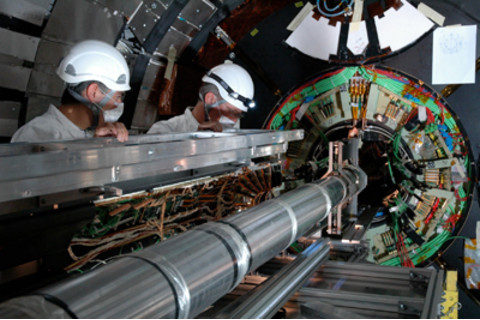 由于互连总线随后汽化,很难确切地说出是什么触发了该事件。 磁体的改造将改善淬灭检测和氦气压力释放系统,但我还没有听说CERN将采取什么措施来防止其他互连出现“电阻区”。 因此问题是:它还会再次发生吗? 很明显,新系统将有助于防止对机器造成严重损坏,但有数千个这样的互连,所以... 无论如何,许多磁体已经从隧道中移除,正在翻新,将在未来几个月内重新安装。 我参与的实验CMS现在处于“开放”状态,端盖被拉回,允许进入内部探测器。 我们在正向像素探测器上的团队计划从二月开始拆除并重新安装我们的探测器,进行小的电气和冷却修复和修改。 去年夏天安装探测器的照片显示了光束管、安装装置和探测器半圆柱体进入,就像瓶中的船一样。 再来一次,从上面,这次带点感觉!