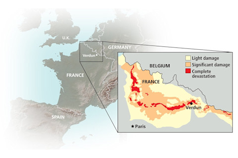 经过10个月的激烈战斗,地貌的破坏如此彻底,以至于一些飞越战场的飞行员称其景象如同月球表面。战场上遍布着人类遗骸、未爆炸的炮弹和锈迹斑斑的铁丝网,这个巨大的战场囊括了包括凡尔登在内的九个被摧毁的法国村庄。来自子弹和炸弹的铅和砷渗透了土壤。