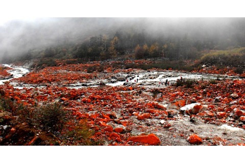 亚吉阿耿河谷位于中国贡嘎山的北坡,看起来像发生了一场大规模的颜料倾倒。但这种红色实际上是完全天然的:它是一种新发现的藻类品种的大量繁殖。