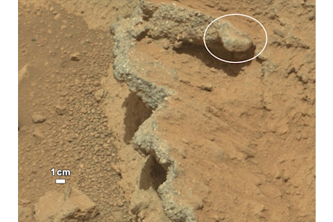 When water flows over stones, it smooths them out and carries them in its path. Even when the steam has long since dried up, the gravel it leaves behind provides distinct evidence of the water's former presence. And now the Curiosity rover has found tell-tale gravel embedded in the Martian bedrock, small stones rounded by water and too large for wind to have transported---rocky proof of water's presence on the Red Planet. Although previous photos suggested that water once flowed on Mars, the rocks in outcrops like the one pictured here, dubbed “Hottah” after Canada's Hottah Lake, are the most definitive evidence of water on Mars that we have ever found. A piece of the embedded gravel, called a clast, is circled in the close-up of Hottah below. Image courtesy of NASA / JPL-Caltech / MSSS