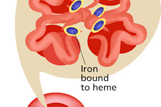 血红蛋白,血液中携带氧气的精髓,是由四分子血红素和四种蛋白质(珠蛋白)组成的形状变化的聚集体。血红素含有结合氧气的铁,而氧气又使它呈现鲜红色。