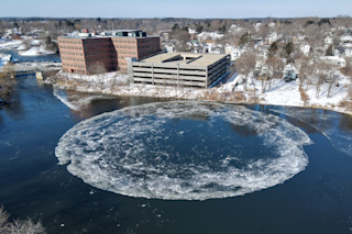 当缅因州韦斯特布鲁克的普雷桑普斯科特河气温骤降时,就具备了形成令人惊叹的自然现象的条件:河上出现一个巨大的冰盘,缓慢地旋转。第一个发现冰盘的卡兰-玛丽·米歇尔说:“它看起来是昨天在一次寒潮中形成的,日期是1月11日。‘没人确定它能持续多久,所以人们都争相来看。这就像一个节日。’”