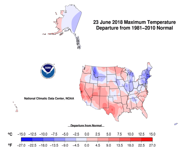 2018年6月23日至7月10日,最高气温与正常值的日偏差。(注:部分日期数据缺失。图片来源:NOAA NCEI。动画:Tom Yulsman)研究表明,热穹顶,即导致气温飙升的高压区域,在近几十年变得更强。例如,国家气象局和宾夕法尼亚州立大学的气象学家在2016年的一项研究中发现,1979年至2010年间,北半球夏季热穹顶的强度有所增加。在7月9日的一篇报道中,《华盛顿邮报》的Jason Samenow引用了一项分析,该分析显示,自20世纪50年代以来,超过特定高强度阈值的热穹顶变得更加普遍。该分析揭示,在西部美国,几乎所有超过该阈值的热穹顶“都发生在1983年之后——绝大多数形成于1990年之后,”Samenow写道。(详情请参阅他的优秀报道。)