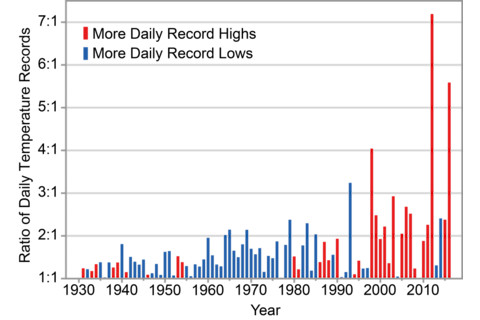美国本土创纪录日气温出现频率的变化。红色条表示日最高气温记录多于日最低气温记录的年份,蓝色条表示日最低气温记录多于日最高气温记录的年份。条形高度表示红色年份中最高气温记录与最低气温记录之比,以及蓝色年份中最低气温记录与最高气温记录之比。(来源:NOAA/NCEI)同样,2017年作为美国国家气候变化评估的一部分发布的一份主要报告得出了以下结论——并具有非常高的置信度