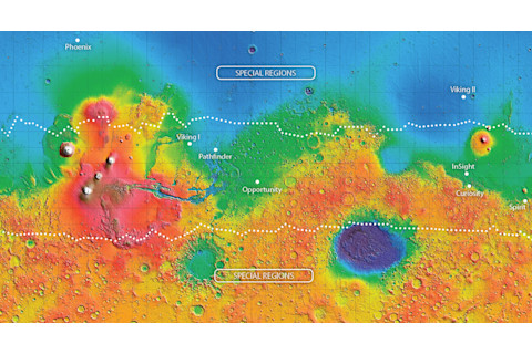 火星的地形图(蓝色代表低洼地区;红色代表高地)揭示了世界上多少地方是禁区:靠近水源的地方被称为“特殊区域”,探索需要额外的消毒。(图片来源:NASA 戈达德太空飞行中心)
