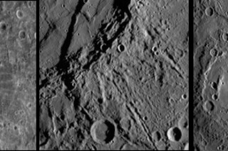 断层线 (中心): “这个峭壁[穿过图片左上方的黑线]是由构造活动形成的,右侧被推到左侧之上,就像典型的地球断层线。 这是水星的主要变形形式[研究人员认为,这发生在]行星收缩时。”
