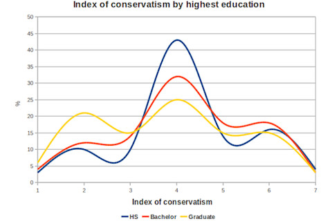 大约 9% 的样本拥有研究生学位,而 25% 的样本拥有学士学位。 所以你并没有真正看到中等的教育程度。 在研究生教育水平上,自我认同为自由派的比例显然存在一些上升的趋势,但最值得注意的趋势是在更聪明或受过更好教育的群体中,自我描述为“中间派”的人数崩溃。 我有时想知道,政治中间派的空洞性是否是“中间派”一词在那些既不是自由派也不是保守派,但具有较高社会经济地位的人中流行的原因之一。 长期读者知道中间派的迟钝,但我认为我应该重申一下。 这很有趣,如果是一致的。 就我而言,我认为我自己的政治观点正变得更加温和。 但不要将相关性与因果关系混淆!