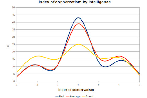 大约~20%的美国人自我认同为“自由派”,而~40%的人自我认同为保守派。一般社会调查 (General Social Survey) 有一个变量 POLVIEWS,它要求个体将自己定位在政治光谱上的一个位置,从“极其自由派”到“极其保守派”,如下所示:1 = 极其自由派 2 = 自由派 3 = 略微自由派 4 = 中间派 5 = 略微保守派 6 = 保守派 7 = 极其保守派。所以换句话说,整数越高,这个人就越保守。 GSS 有一个变量 EDUCATION,它记录了获得的最高学历。它分为三个类别:高中、学士学位和研究生学位(我假设那些没有完成高中学业的人被省略了,因为他们没有接受过教育?)。 此外,它还有一个 10 个单词的词汇测试 WORDSUM,该测试与一般智力相关性为 0.71。我将那些在 0-4 区间的人(他们在测试中正确回答了 0 到 4 个答案)归类为“迟钝”。 5-8 我标记为“普通”。 最后,9 和 10 我标记为聪明(在总数据集中,大约 20% 是迟钝的,65% 是普通的,15% 是聪明的)。 将样本限制在 2000 年及以后,我制作了以下图表: