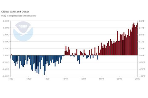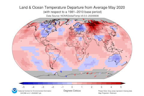 根据NOAA的数据,2020年5月是连续第44个(也是连续第425个月)五月气温高于20世纪平均水平。 (图片来源:NOAA)