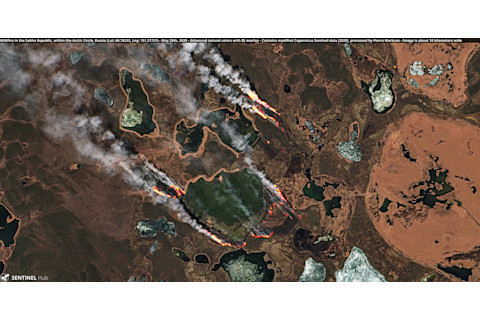 这张图像显示了2020年5月29日,俄罗斯萨哈共和国北极圈内发生的野火,使用了Sentinel 2卫星获取的数据。该图像覆盖的区域约为11英里。 (图片来源:Modified Copernicus Sentinel data processed by Pierre Markuse)