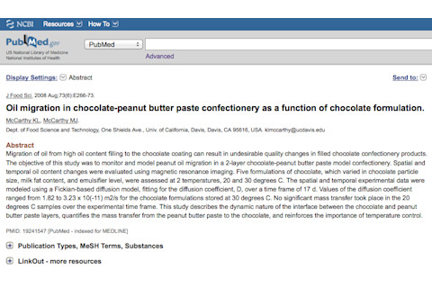 巧克力花生酱膏糖果中油类迁移与巧克力配方之间的关系。 “高油含量馅料向巧克力涂层的油类迁移会导致填充巧克力糖果产品出现不良的质量变化。本研究的目的是监测和模拟双层巧克力花生酱膏模型糖果中的花生油迁移。使用磁共振成像评估空间和时间上的油含量变化。评估了五种巧克力配方,这些配方在巧克力颗粒大小、乳脂肪含量和乳化剂水平上有所不同,并在20度和30摄氏度两种温度下进行评估。使用基于菲克定律的扩散模型对空间和时间实验数据进行建模,在17天的时间范围内拟合扩散系数D。在30摄氏度下储存的巧克力配方中,扩散系数的值范围为1.82至3.23 x 10(-11) m2/s。在20摄氏度的样品中,在实验时间范围内没有发生显著的质量传递。本研究描述了巧克力和花生酱膏层之间的动态界面,量化了花生酱膏向巧克力的质量传递,并强调了温度控制的重要性。”