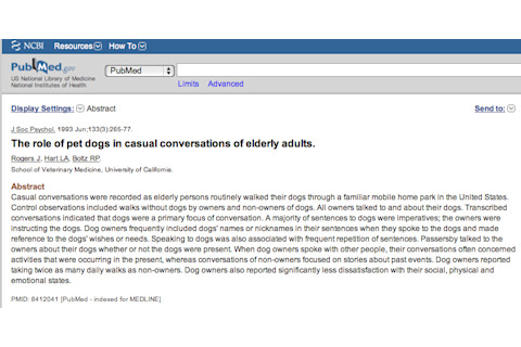 “研究人员记录了老年人在美国一处熟悉的移动房屋公园里遛狗时的日常对话。对照观察包括狗主人和非狗主人的步行。所有主人都会与他们的狗交谈,并谈论他们的狗。转录的对话表明,狗是对话的主要焦点。对狗的句子中,大部分是祈使句;主人在指示狗。狗主人在与狗说话时,经常会在句子中包含狗的名字或昵称,并提及狗的愿望或需求。与狗交谈还伴随着频繁的句子重复。路人会与主人谈论他们的狗,无论狗是否在场。当狗主人与其他 人交谈时,他们的对话通常关注正在发生的事情,而非狗主人的对话则侧重于过去事件的故事。狗主人报告说,他们每天的步行次数是狗主人的两倍。狗主人还报告说,他们对自己的社交、身体和情感状态感到明显不满。”