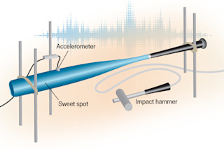 在采访了几位大学球员后,Russell 了解到他们都在同一个部位感到疼痛:握持时上手的拇指和食指之间的肉质组织。他们都用大致相同的地方握住球棒,因此 Russell 在他的实验室中分析了相应区域。他使用了两个橡皮筋,连接到悬挂球棒的框架的两端。然后,他用锤子敲击球棒的不同位置。一个加速度计固定在球棒的杆身上,跟踪振动,而锤子尖端的传感器测量施加的力。