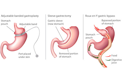 近年来,减少食物摄入量的减肥手术变得越来越普遍。其中三种手术包括可调节胃束带术,用灵活的“束带”收缩胃;袖状胃切除术,切除部分胃;以及流行的 R-Y 胃旁路手术,涉及将胃打结以减小其体积。