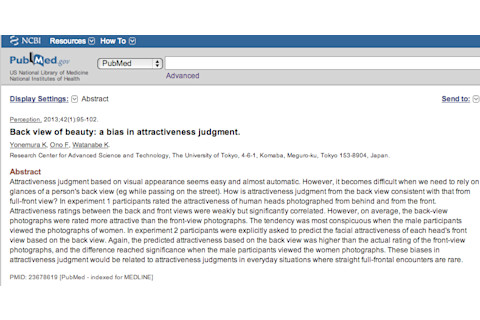 图片:flickr/bradleygee你是否曾从背后看一个人,想象他们的脸,结果他们转过身来,看起来和你预期的完全不同(甚至可能是相反的性别)?在这项研究中,科学家让受试者对人头从背后和正面的照片的吸引力进行评分。同一人头从背部的照片被评为比从正面的照片更具吸引力,尤其是在男性评价女性照片时。受试者(同样,尤其是男性)还预测这个人从正面会比他们实际评分的更具吸引力。所以下次当你考虑接近一个从背后看起来很火辣的人时,科学告诉你,你应该先等他们转过身来。美的背影:吸引力判断中的偏见。 “基于视觉外观的吸引力判断似乎很容易且几乎是自动的。然而,当我们不得不依赖对一个人背影的瞥见(例如在街上擦肩而过时)时,它就会变得困难。从背影判断的吸引力与从正前方判断的吸引力有多大一致性?在实验1中,参与者对从背后和从正面拍摄的人头照片的吸引力进行了评分。背影和正脸照片之间的吸引力评分相关性较弱但显著。然而,平均而言,背影照片被评为比正脸照片更具吸引力。当男性参与者观看女性照片时,这种趋势最为明显。在实验2中,参与者被明确要求根据背影预测每个头像正脸的吸引力。同样,基于背影预测的吸引力高于正脸照片的实际评分,当男性参与者观看女性照片时,这种差异达到了显著性。这些吸引力判断中的偏见可能与日常生活中吸引力判断有关,在日常生活中,完全正面的相遇并不常见。”
