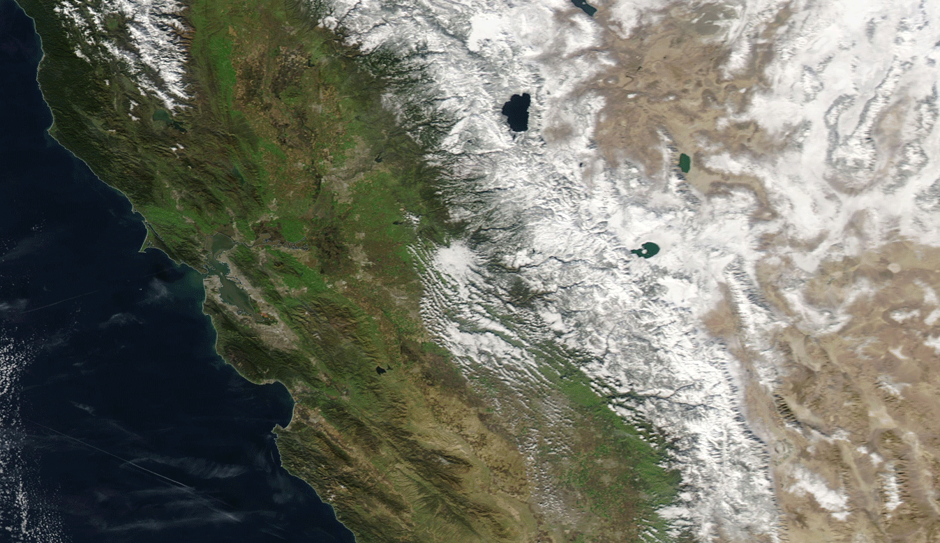 正如上面的动画所示,加州内华达山脉的积雪自 12 月底以来显著减少。(为了帮助您确定地理方位,画面中偏上方的那个大湖是太浩湖。)
