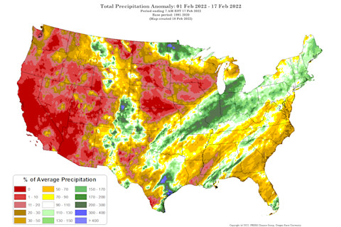 美国西部山区本应积累健康的积雪来为城镇、农场和工业供水,但 2 月份至今,该地区大部分地区的降水一直稀少。(图片来源:Copyright ©2022, PRISM Climate Group, Oregon State University, https://prism.oregonstate.edu。地图绘制日期:2022 年 2 月 18 日。)