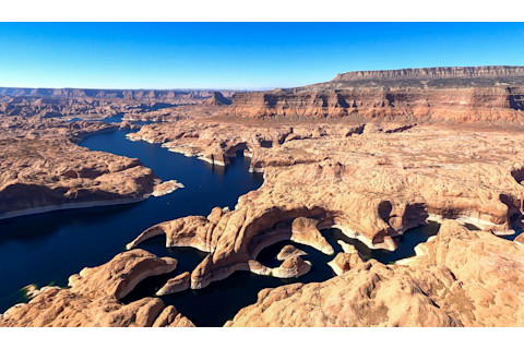 2020 年 10 月 12 日拍摄的鲍威尔湖(美国第二大水库)的航拍照片。水面以上可见的浅色岩石带显示了湖水下降了多少——这是一个令人不安的“浴缸环”,标志着二十年来巨旱的剧烈影响。(图片来源:Waterdesk.org / Lighthawk.org)