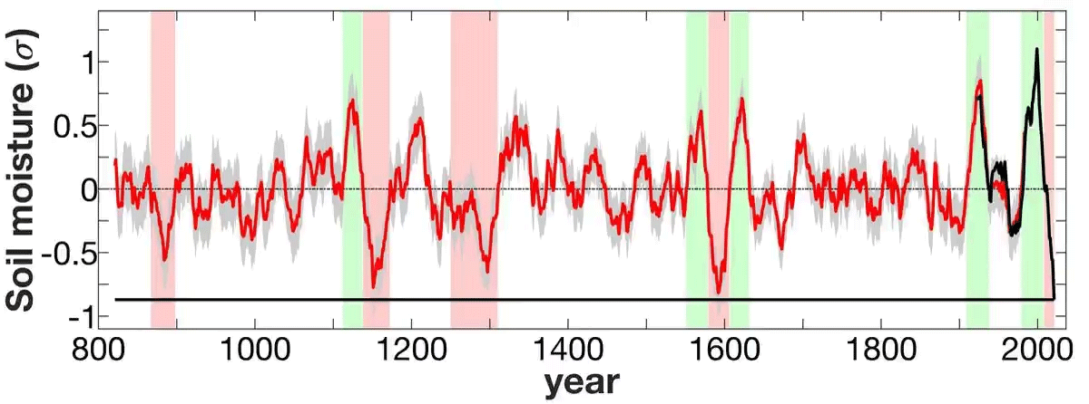 研究人员使用树木年轮重建了自公元 800 年以来的土壤湿度。他们还利用气候模型来估计人为升温对观测到的干旱的贡献程度。